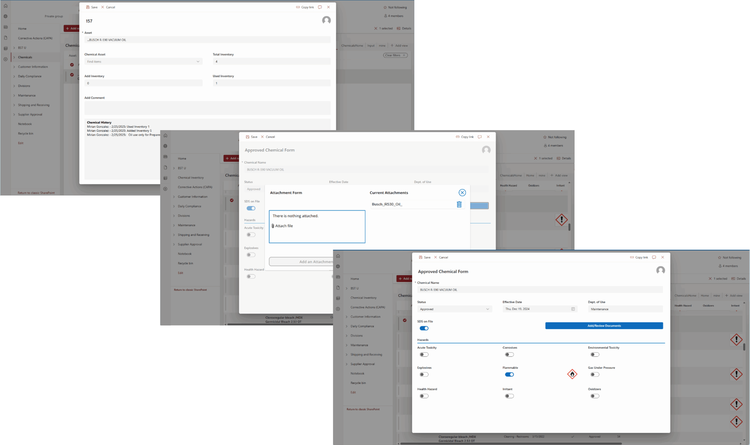 - Streamlining Workflows: Creates workflows to manage chemical approvals, provide low supply reminders, and prompt regular chemical and SDS review.