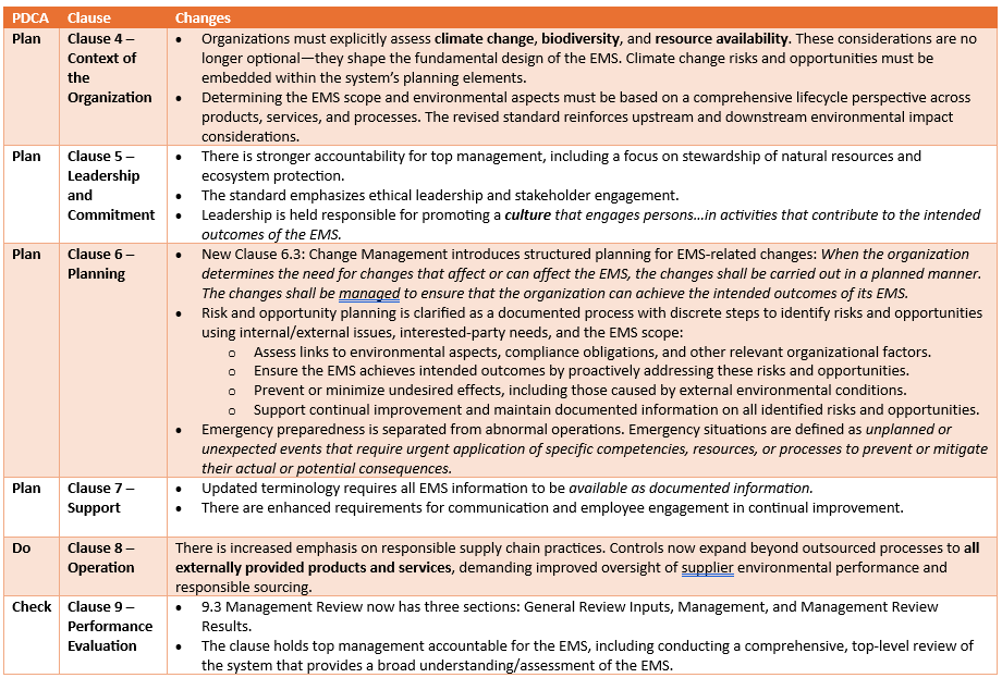 The ISO 14001:2026 revision incorporates changes to enhance climate awareness, lifecycle responsibility, supplier oversight, and leadership accountability. The table below outlines the major clause-level changes in the revised standard.